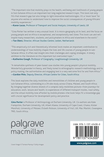 This book explores the daily mobilities and immobilities of children and young people in sub-Saharan Africa. The authors draw on findings from rural and urban field research extending over many years, culminating in a 24-site study across three African countries: Ghana, Malawi, and South Africa. Wider reflections on gender, relationality, the politics of mobility, and field methodology frame the study. By bringing together diverse strands of a complex daily mobilities picture-from journeys for education, work, play/leisure and health, to associated experiences of different transport modes, road safety, and the virtual mobility now afforded by mobile phones-the book helps fill a knowledge gap with crucial significance for development policy and practice.