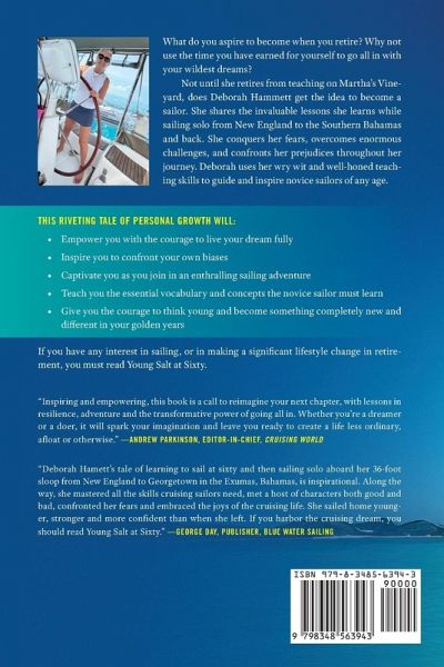 What do you aspire to become when you retire? Why not use the time you have earned for yourself to go all in with your wildest dreams? Not until she retires from teaching on Martha's Vineyard, does Deborah Hammett get the idea to become a sailor. She uses her wry wit and well-honed teaching skills to guide and inspire novice sailors of any age. Deborah shares the invaluable lessons she learns while sailing solo from New England to the Southern Bahamas and back. She conquers her fears, overcomes enormous challenges, and confronts her prejudices throughout her journey. This riveting tale of personal growth will: * Empower you with the courage to live your dream fully * Inspire you to confront your own biases * Captivate you as you join in an enthralling sailing adventure * Teach you the essential vocabulary and concepts the novice sailor must learn * Give you the courage to think young and become something completely new and different in your golden years If you are interested in sailing or making a significant lifestyle change in retirement, you must read Young Salt at Sixty.
