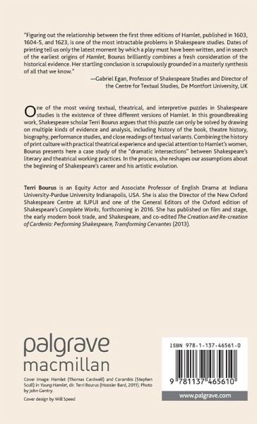 "For about two centuries we have been seeking answers to the various riddles surrounding the three texts of Hamlet. Previous commentators have worked from bibliographical, literary-historical, or theatrical perspectives and have not come up with fully satisfactory answers. However, Bourus combines all these approaches, since she is trained in all these areas, and comes up with surprising and very satisfactory answers. Anyone seriously interested in Hamlet must read this book." - William Proctor Williams, Adjunct Professor of English, University of Akron, USA, and author of An Introduction to Bibliographical and Textual Studies, 4th edition (2009)