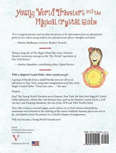With a Magical Crystal Globe, where would you go? Six children from a small Florida town set off on an adventure to New York, using their imaginations and Mrs. Eva's Magic Crystal Globe. "Close your eyes . . ." she says. Imagine . . . Poof! The Young World Travelers are in Queens, New York, for their first Magical Crystal Globe adventure, where they visit famous sites, such as the Queens County Farm, a civil war fort, and Flushing Meadows, the site of the 1938 and 1964 World's Fairs! They ride a train, a covered wagon, and a classic car to their various destinations, sometimes even dressed in the clothing of the times! Suddenly faraway places are not so far, and history meets the present in a colorful display of imagination. Will you become a Young World Traveler too? ~~~~~ "EDU-TAINMENT" The Young World Travelers¿ series The Young World Travelers¿ invite you on many exciting journeys to explore THEIR worlds ... The series is intended to be a "reference library" of travel from a child's perspective. From story to story, the Young World Travelers¿ will share the histories of each place they visit, the cultures, the architecture, the modes of travel, currency, food and music, to name a few. The stories will also incorporate the concepts of sharing and manners, compassion and empathy, and integrity. The educational aspect along with the uplifting camaraderie combine to offer a new form of learning: edu-tainment!