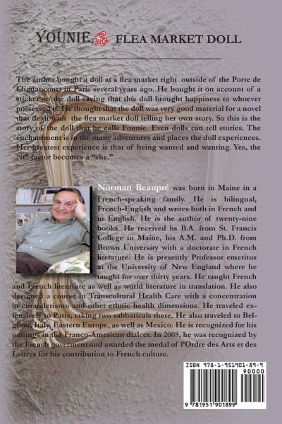 The author bought a doll at a flea market right outside of the Porte de Clignancourt in Paris several years ago. He bought it on account of a sticker on the doll saying that this doll brought happiness to whoever possessed it. He thought that the doll was very good material for a novel that dealt with the flea market doll telling her own story. So this is the story of the doll that he calls Founie. Even dolls can tell stories. The enchantment is in the many adventures and places the doll experiences. Her greatest experience is that of being wanted and wanting. Yes, the "it" factor becomes a "she."