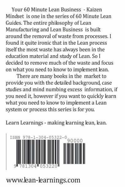 Your 60 Minute Lean Business - Kaizen Mindset is one in the series of 60 Minute Lean Guides. The entire philosophy of Lean Manufacturing and Lean Business is built around the removal of waste from processes. I found it quite ironic that in the Lean process itself the most waste has always been in the education material and study of Lean. So I decided to remove much of the waste and focus on what you need to know to implement lean. There are many books in the market to provide you with the detailed background, case studies and mind numbing excess information, if you need it, however if you want to quickly learn what you need to know to implement a Lean system or process this series is for you.