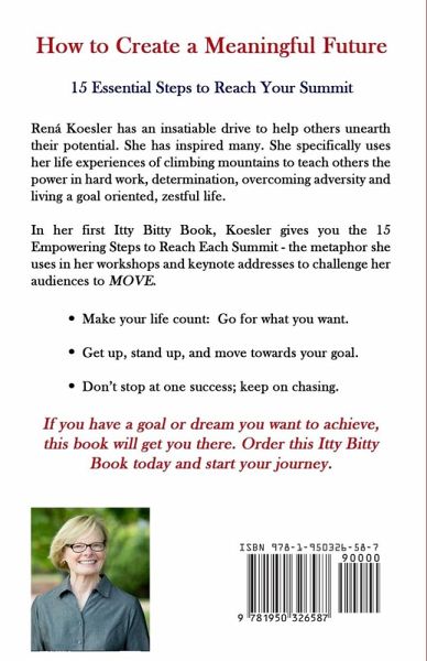 How to Create a Meaningful Future 15 Empowering Steps to Reach Your Summit Rená Koesler has an insatiable drive to help others unearth their potential. She has inspired many. She specifically uses her life experiences of climbing mountains to teach others the power in hard work, determination, overcoming adversity and living a goal oriented, zestful life. In her first Itty Bitty Book, Koesler gives you the 15 Empowering Steps to Reach Each Summit - the metaphor she uses in her workshops and keynote addresses to challenge her audiences to MOVE. * Make your life count: Go for what you want. * Get up, stand up, and move towards your goal. * Don't stop at one success; keep on chasing. If you have a goal or dream you want to achieve, this book will get you there. Order this Itty Bitty Book today and start your journey.