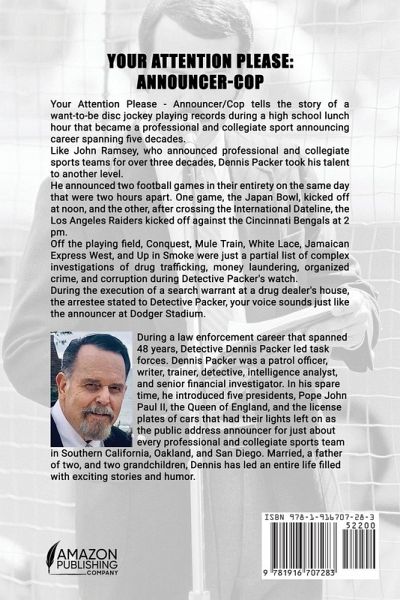 Your Attention Please - Announcer/Cop tells the story of a want-to-be disc jockey playing records during a high school lunch hour that became a professional and collegiate sport announcing career spanning five decades. Like John Ramsey, who announced professional and collegiate sports teams for over three decades, Dennis Packer took his talent to another level. He announced two football games in their entirety on the same day that were two hours apart. One game, the Japan Bowl, kicked off at noon, and the other, after crossing the International Dateline, the Los Angeles Raiders kicked off against the Cincinnati Bengals at 2 pm. Off the playing field, Conquest, Mule Train, White Lace, Jamaican Express West, and Up in Smoke were just a partial list of complex investigations of drug trafficking, money laundering, organized crime, and corruption during Detective Packer's watch. During the execution of a search warrant at a drug dealer's house, the arrestee stated to Detective Packer, your voice sounds just like the announcer at Dodger Stadium.