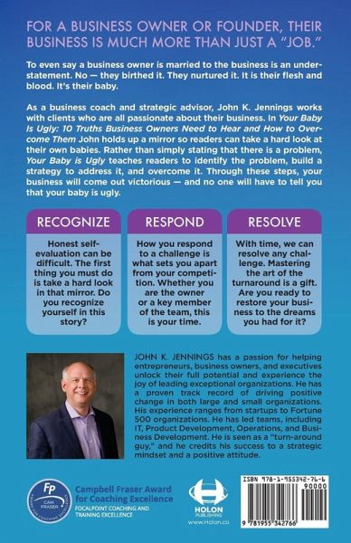 To even say a business owner is married to the business is an understatement. No - they birthed it. They nurtured it. It is their flesh and blood. It's their baby. As a business coach and strategic advisor, John K. Jennings works with clients who are all passionate about their businesses. In Your Baby Is Ugly: 10 Truths Business Owners Need to Hear and How to Over-come Them John holds up a mirror so readers can take a hard look at their own babies. Rather than simply stating that there is a problem, Your Baby is Ugly teaches readers to identify the problem, build a strategy to address it, and overcome it. Through these steps, your business will come out victorious - and no one will have to tell you that your baby is ugly.