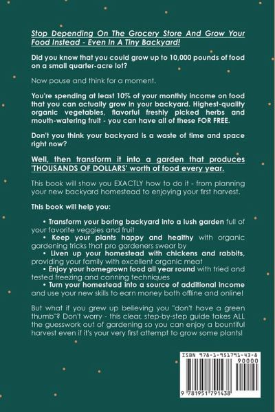 Stop Depending On The Grocery Store And Grow Your Food Instead - Even In A Tiny Backyard! Did you know that you could grow up to 10,000 pounds of food on a small quarter-acre lot? Now pause and think for a moment. You're spending at least 10% of your monthly income on food that you can actually grow in your backyard. Highest-quality organic vegetables, flavorful freshly picked herbs and mouth-watering fruit - you can have all of these FOR FREE. Don't you think your backyard is a waste of time and space right now? Well, then transform it into a garden that produces THOUSANDS OF DOLLARS' worth of food every year. This book will show you EXACTLY how to do it - from planning your new backyard homestead to enjoying your first harvest.This book will help you:Transform your boring backyard into a lush garden full of your favorite veggies and fruit Keep your plants happy and healthy with organic gardening tricks that pro gardeners swear by Liven up your homestead with chickens and rabbits, providing your family with excellent organic meat Enjoy your homegrown food all year round with tried and tested freezing and canning techniques Turn your homestead into a source of additional income and use your new skills to earn money both offline and online! But what if you grew up believing you "don't have a green thumb"? Don't worry - this clear, step-by-step guide takes ALL the guesswork out of gardening so you can enjoy a bountiful harvest even if it's your very first attempt to grow some plants!Scroll up, click on "Buy now" and in a few years' time, you'll forget the route to the grocery store!