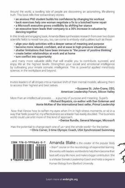WINNER: Nautilus Books for a Better World - Social Science Around the world, a swelling tide of people are discovering an astonishing, life-altering truth. This book tells their extraordinary stories: an anxious PhD student builds his confidence by changing his workout back exercises help one woman negotiate a fix to a botched home repair a Microsoft executive grows credibility by shifting her stance an executive team leads their company to a 30% increase in valuation by dancing together In this timely and engaging book, Amanda Blake synthesizes research from over two dozen scientific fields to reveal how you, too, can come to embody vital qualities such as these: align your daily activities with a deeper sense of meaning and purpose become more relaxed, confident, and at ease in high-pressure situations shatter limitations that have been immune to "the power of positive thinking" create better relationships at work and at home turn conflict into opportunity ...and many more valuable skills that will enable you to contribute, succeed and enjoy life at the highest levels. Strengthen your social and emotional intelligence by cultivating your innate somatic intelligence. This is powerful applied mind-body science, in the workplace and beyond. Tap the intelligence hidden in posture, gesture, and sensation and you will open the door to more meaning, greater courage, deeper connection, and more powerful leadership than you imagined possible. WINNER: International Book Awards - Psychology/Mental Health WINNER: Indie Excellence Awards - Leadership