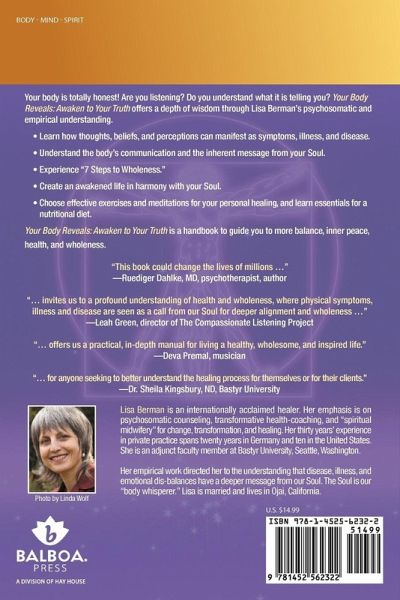 Your body is totally honest! Are you listening? Do you understand what it is telling you? Your Body Reveals: Awaken to Your Truth offers a depth of wisdom through Lisa Berman's psychosomatic and empirical understanding. Learn how thoughts, beliefs, and perceptions can manifest as symptoms, illness, and disease. Understand the body's communication and the inherent message from your Soul. Experience "7 Steps to Wholeness." Create an awakened life in harmony with your Soul. Choose effective exercises and meditations for your personal healing, and learn essentials for a nutritional diet. Your Body Reveals: Awaken to Your Truth is a handbook to guide you to more balance, inner peace, health, and wholeness. "This book could change the lives of millions ..." -Ruediger Dahlke, MD, psychotherapist, author >p>"... invites us to a profound understanding of health and wholeness, where physical symptoms, illness and disease are seen as a call from our Soul for deeper alignment and wholeness ..." -Leah Green, director of The Compassionate Listening Project "... offers us a practical, in-depth manual for living a healthy, wholesome, and inspired life." -Deva Premal, musician "... for anyone seeking to better understand the healing process for themselves or for their clients." -Dr. Sheila Kingsbury, ND, Bastyr University