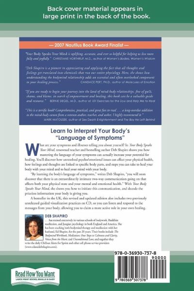 What are your symptoms and illnesses telling you about yourself? In Your Body Speaks Your Mind, renowned teacher and bestselling author Deb Shapiro shows you how mastering the language of your symptoms can actually increase your potential for healing. You'll discover how unresolved psycho/emotional issues can affect your physical health, how feelings and thoughts are linked to specific body parts, and steps you can take to heal your body with your mind and to heal your mind with your body. By learning the body's language of symptoms,'' writes Deb Shapiro, ''you will soon discover that there is an extraordinarily intimate two-way communication going on that affects both your physical state and your mental and emotional health.'' With Your Body Speaks Your Mind, she shows you how to initiate this communication, and decode the priceless information your body is giving you.