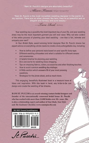 How to Plan Your Own Dream Wedding Your wedding day is possibly the most important day of your life, and your wedding dress may be the most important garment you will ever wear. Why not take control of the entire process of planning your ideal wedding - one that is fun, intimate and uniquely your own? In Your Bridal Style, award-winning bridal designer Rani St. Pucchi shares her expert advice on everything a bride needs to create a truly unforgettable day, including: A helpful timeline for planning every aspect of your wedding How to choose your venue and your destination to reflect your style Your wedding budget and how to get the most for your money How to define your personal style based on your specific body type How to avoid common wedding day mishaps. Insider Wedding Dress Tips For more than 30 years Rani St. Pucchi's wedding gowns have been embraced by celebrities, athletes, actresses, singers, and more than 20,000 brides. In Your Bridal Style, she offers you countless insider wedding dress tips such as: How to choose the most flattering style for your figure What to look for in fabrics, laces, and trims Commonly used terms every bride should know before dress shopping Tips for the budget-savvy bride: should you buy online, on sale, or rent? Is nude the new white? The crowning glory: the veil Finishing touches: embellishments and accessories How to bustle your wedding dress Intimate apparel ideas for underneath! Do's and don'ts for wedding dress shopping Perfecting the Details to Reflect Your style In Your Bridal Style there are even chapters covering all those little (and very important) details such as: Strategies for the photo shoot The wedding planner Bridesmaids: Yes or No? Mother of the bride Getting in shape for your wedding day Marriage legalities After the wedding Chapter 25 of this comprehensive 350-page book includes an FAQ: 53 of Your Most Pressing Questions Answered and Chapter 26 gives you 101 Wedding Tips to ensure you have the most memorable day. This engaging, beautifully illustrated book is a treasure trove of ideas and inspiration. With this book in hand, any bride-to-be can design and create the wedding of her dreams. Scroll up and order your copy of Your Bridal Style today and begin creating your dream wedding today.