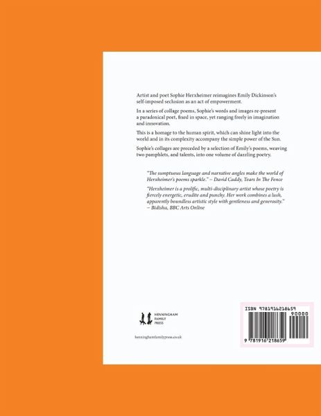 Artist and poet Sophie Herxheimer reimagines Emily Dickinson's self-imposed seclusion as an act of empowerment. In a series of collage poems, Sophie's words and images re-present a paradoxical poet, fixed in space, yet ranging freely in imagination and innovation. This is a homage to the human spirit, which can shine light into the world and in its complexity accompany the simple power of the sun. Sophie's collages are preceded by a selection of Dickinson's poems, interweaving two talents into one volume of dazzling poetry.