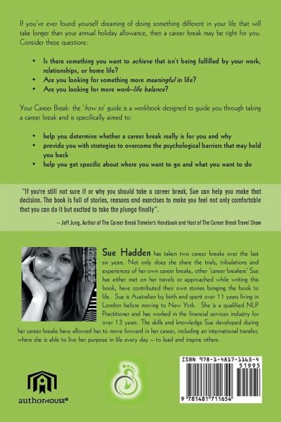 If you've ever found yourself dreaming of doing something different in your life that will take longer than your annual holiday allowance, then a career break may be right for you. Consider these questions: Is there something you want to achieve that isn't being fulfilled by your work, relationships, or home life? Are you looking for something more meaningful in life? Are you looking for more work-life balance? Your Career Break: the 'how to' guide is a workbook designed to guide you through taking a career break and is specifically aimed to: help you determine whether a career break really is for you and why provide you with strategies to overcome the psychological barriers that may hold you back help you get specific about where you want to go and what you want to do "If you're still not sure if or why you should take a career break, Sue can help you make that decision. The book is full of stories, reasons and exercises to make you feel not only comfortable that you can do it but excited to take the plunge finally". -- Jeff Jung, Author of The Career Break Traveler's Handbook and Host of The Career Break Travel Show