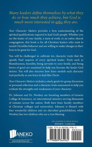 Many leaders define themselves by what they do or how much they achieve, but God is much more interested in who they are. Your Character Matters provides a firm understanding of the spiritual qualifications required to lead God's people. Whether you are the leader of your family, a team at work, or an entire church congregation, this book is for all Christian leaders who want to model Christlike behavior and are willing to make changes in their lives to be great for God. You will be challenged to cultivate ten character traits that the apostle Paul requires of every spiritual leader. Traits such as blamelessness, humility, being servants to your family, and being lovers of good are examined to help you become the leader God desires. You will also discover how Jesus models each character trait perfectly as you learn to lead like Christ. Your Character Matters includes a study guide for group discussion or personal reflection and a character traits assessment to help you evaluate the strengths and weaknesses of your character.