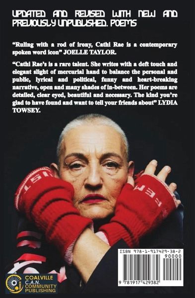 "Ruling with a rod of irony, Cathi Rae is a contemporary spoken word icon". JOELLE TAYLOR "Cathi Rae's is a rare talent. She writes with a deft touch and elegant slight of mercurial hand to balance the personal and public, lyrical and political, funny and heart-breaking narrative, open and many shades of in between. Her poems are detailed, clear eyed, beautiful and necessary. The kind you're glad to have found and want to tell your friends about". LYDIA TOWSEY
