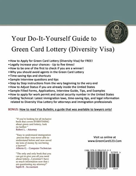 Visa Lottery is one of the overlooked subjects in the immigration system. Every year, over 100,000 applicants are selected and receive United States Permanent Residency through the Lottery system. While there are numerous other books that describe various methods of obtaining green cards, or general ways of obtaining one, no book in the market currently goes over this subject in detail. This is the case while over 40 million people apply for Diversity Visa Lottery every year! In summary, the book provides detail overview and step-by-step process of the following: ¿ How to Apply for Green Card Lottery (Diversity Visa) for FREE! ¿ Be one of the first to check if you're the winner! ¿ Legally increase your changes - Up to five times ¿ Over 2 million applications are disqualified every year; how to avoid getting disqualified ¿ Why you should avoid agents in the Green Card Lottery ¿ Step by Step instruction from the very beginning to the very end along with snapshot and examples ¿ Time-saving tips and shortcuts ¿ Sample Interview questions and tips ¿ How to apply for the lottery whether you're outside of the United States or Inside ¿ Sample Immigration Filled Forms, Applications, Interview Guide, Tips, and Examples. ¿ How to Adjust Status if you are alaready inside the United States ¿ How to apply for work permit, and Social security number once you are a permanent resident. ¿ Getting Technical: Latest immigration laws, time-saving tips, and legal information related to Diversity Visa Lottery for attorneys and immigration professionals ¿ and as bonus: How to read Visa Bulletin; a guide that was avaialble to lawyers only! Most people believe that they have to pay to agents to apply for the visa lottery; what they do not know is that with increasing number of fraudulent agents their applications may never get submitted through the United States Lottery Systems, and while agents charge to apply for the diversity visa, the application is entirely free by directly applying to United States Immigration Service! Millions of people apply for Diversity Visa Lottery every year and this is a very large audience that can take advantage of the information in the book. There are currently 2 other titles in the market that briefly go over the Diversity Visa Lottery; this is the case while the Lottery process is a complex one with many different factors to consider. This book explains the process from the beginning to the very end and has all the information that an individual needs to participate and achieve a permanent residency status in the United States. This is the only book that describes the Diversity Visa in detail along with sample forms and instructions. The book also goes over a phenomenon that individuals can use to increase their chances without getting themselves disqualified. The book also has advanced details for attorney or paralegals in appendix section.