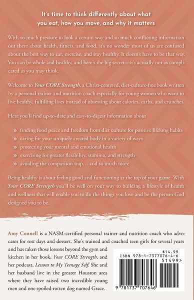 It's time to think differently about what you eat, how you move, and why it matters With so much pressure to look a certain way and so much conflicting information out there about health, fitness, and weight loss, it's no wonder most of us are confused about the best way to eat, exercise, and stay healthy. It doesn't have to be that way. You can be whole and healthy, and here's the big secret-it's actually not as complicated as you may think. Welcome to Your CORE Strength, a Christ-centered, diet-culture-free book written by a personal trainer and nutrition coach especially for young women who want to live healthy, fulfilling lives instead of obsessing about calories, carbs, and crunches. Here you'll find up-to-date and easy-to-digest information about discovering how your calling impacts your health journey developing lifelong eating habits that sustain you physically and mentally finding food peace and freedom from diet culture caring for your uniquely created body in a variety of ways protecting your mental and emotional health exercising for greater flexibility, stamina, and strength setting healthy boundaries in your relationships avoiding the comparison trap and so much more Being healthy is about feeling good and functioning at the top of your game. With Your CORE Strength you'll be well on your way to building a lifestyle of health and wellness that will enable you to do the things you love and be the person you were designed to be.