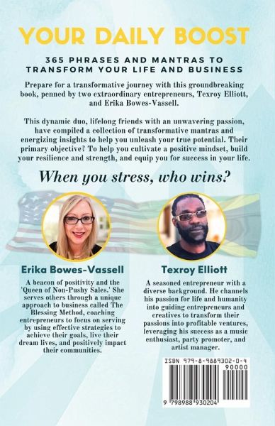 In a world that constantly demands our time and attention, how often do we give ourselves the chance to pause, reflect, and recharge? Every day presents a new challenge. A new hurdle to overcome. A new opportunity to be seized. Wouldn't it be powerful if we had a tool to provide us with a daily dose of inspiration and energy to meet those challenges head-on? Welcome to Your Daily Boost 365. Texroy Elliott and Erika Bowes-Vassell, two formidable minds with a shared history, have come together to offer you just that. Through their combined experiences, wisdom, and deep-rooted conviction that every individual possesses an untapped reservoir of potential, they bring to you 365 insights-each day, a new beacon of inspiration. Growing up and throughout their lives Texroy and Erika experienced firsthand the importance of resilience, motivation, and the indomitable human spirit. They've witnessed the power of mindset in turning challenges into stepping stones, and with this book, they invite you to experience the same transformation. The essence of Your Daily Boost 365 isn't just about feeling good momentarily. It's about embedding positive, proactive behaviors and beliefs into your life. It's about recognizing that motivation isn't merely a fleeting emotion but a habit that can be cultivated and harnessed. Each page you turn will introduce you to a mantra or insight carefully crafted to empower, uplift, and propel you forward. Some days, the words might challenge you, nudging you out of your comfort zone, while others might offer solace and understanding. But every single day, they will aim to ignite a fire within. This book is not just another collection of quotes. It's a daily mentor, a silent partner, and a steadfast friend. It's your compass on days you feel lost and your anchor on days you feel overwhelmed. In Your Daily Boost 365, you are not alone. With Texroy and Erika as your guides, be prepared to embrace each day with renewed vigor, passion, and determination. Open this book with an open heart, and witness the unfolding of a more confident, empowered, and successful version of yourself. Now, let the journey begin!