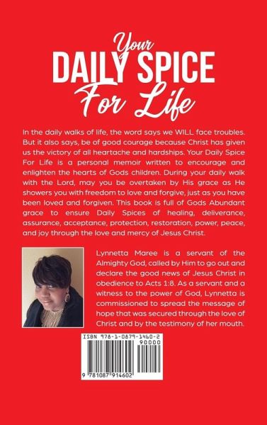 In the daily walks of life, the word says we WILL face troubles. But it also says, be of good courage because Christ has given us the victory of all heartache and hardships. Your Daily Spice For Life is a personal memoir written to encourage and enlighten the hearts of Gods children. During your daily walk with the Lord, may you be overtaken by His grace as He showers you with freedom to love and forgive, just as you have been loved and forgiven. This book is full of Gods Abundant grace to ensure Daily Spices of healing, deliverance, assurance, acceptance, protection, restoration, power, peace, and joy through the love and mercy of Jesus Christ.