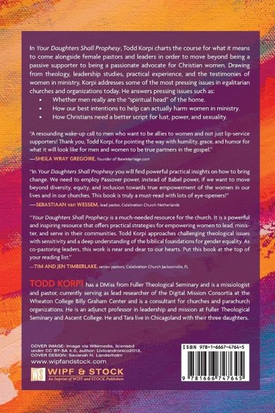 In Your Daughters Shall Prophesy, Todd Korpi charts the course for what it means to come alongside female pastors and leaders in order to move beyond being a passive supporter to being a passionate advocate for Christian women. Drawing from theology, leadership studies, practical experience, and the testimonies of women in ministry, Korpi addresses some of the most pressing issues in egalitarian churches and organizations today. He answers pressing issues such as: -Whether men really are the ""spiritual head"" of the home. -How our best intentions to help can actually harm women in ministry. -How Christians need a better script for lust, power, and sexuality.