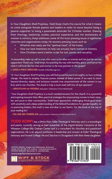 In Your Daughters Shall Prophesy, Todd Korpi charts the course for what it means to come alongside female pastors and leaders in order to move beyond being a passive supporter to being a passionate advocate for Christian women. Drawing from theology, leadership studies, practical experience, and the testimonies of women in ministry, Korpi addresses some of the most pressing issues in egalitarian churches and organizations today. He answers pressing issues such as: -Whether men really are the ""spiritual head"" of the home. -How our best intentions to help can actually harm women in ministry. -How Christians need a better script for lust, power, and sexuality.