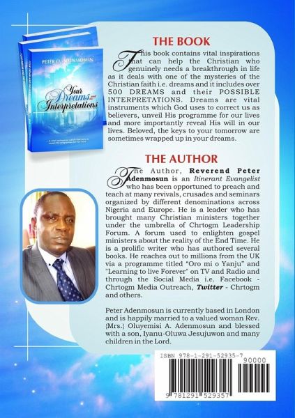This book contains vital inspiration that can help the Christian who genuinely needs a breakthrough in life as it deals with one of the mysteries of the Christian faith i.e. dreams and it includes over 500 types of dreams and their possible interpretations. Dreams are vital instruments which God uses to correct us as believers, unveil His program for our lives and more importantly reveal His will in our lives. Beloved, the key to your tomorrow is sometimes wrapped up in your dreams.