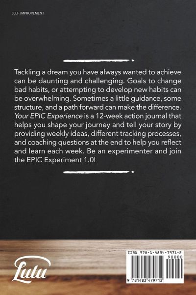 Tackling a dream you have always wanted to achieve can be daunting and challenging. Goals to change bad habits, or attempting to develop new habits can be overwhelming. Sometimes a little guidance, some structure, and a path forward can make the difference. Your EPIC Experience is a 12-week action journal that helps you shape your journey and tell your story by providing weekly ideas, different tracking processes, and coaching questions at the end to help you reflect and learn each week. Be an experimenter and join the EPIC Experiment 1.0!