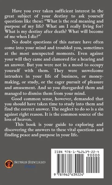 Have you ever taken sufficient interest in the great subject of your destiny to ask yourself questions like these: "What is the real meaning and purpose of my life? What am I really living for? What is my destiny after death? What will become of me when I die?" No doubt questions of this nature have often come into your mind and troubled you, sometimes at the most unexpected moments. Even against your will they came and clamored for a hearing and an answer. But you were not in a mood to occupy yourself with them. They were unwelcome intruders in your life of business, or money-making, or study, or the eager pursuit of pleasure and amusement. And so you disregarded them and managed to dismiss them from your mind. Good common sense, however, demanded that you should have taken time to study into them and find the correct answer. The neglect to do so is a sin against right reason. It is the common source of the loss of heaven. This book is your guide to exploring and discovering the answers to these vital questions and finding peace and purpose in your life.