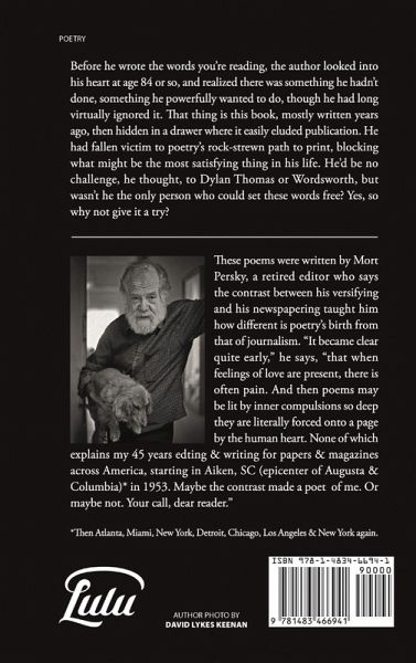 Before he wrote the words you're reading, the author looked into his heart at age 84 or so, and realized there was something he hadn't done, something he powerfully wanted to do, though he had long virtually ignored it. That thing is this book, mostly written years ago, then hidden in a drawer where it easily eluded publication. He had fallen victim to poetry's rock-strewn path to print, blocking what might be the most satisfying thing in his life. He'd be no challenge, he thought, to Dylan Thomas or Wordsworth, but wasn't he the only person who could set these words free? Yes, so why not give it a try?