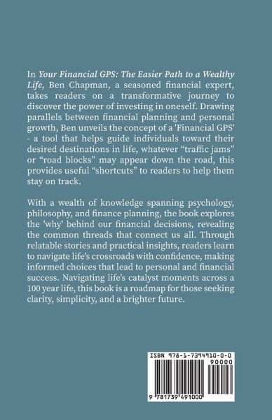 In Your Financial GPS: The Easier Path to a Wealthy Life, Ben Chapman, a seasoned financial expert, takes readers on a transformative journey to discover the power of investing in oneself. Drawing parallels between financial planning and personal growth, Ben unveils the concept of a 'Financial GPS' - a tool that helps guide individuals toward their desired destinations in life, whatever "traffic jams" or "road blocks" may appear down the road, this provides useful "shortcuts" to readers to help them stay on track. With a wealth of knowledge spanning psychology, philosophy, and finance planning, the book explores the 'why' behind our financial decisions, revealing the common threads that connect us all. Through relatable stories and practical insights, readers learn to navigate life's crossroads with confidence, making informed choices that lead to personal and financial success. Navigating life's catalyst moments across a 100 year life, this book is a roadmap for those seeking clarity, simplicity, and a brighter future.