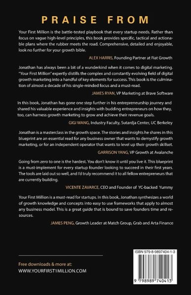 Featured on TechCrunch, Yahoo, AdWeek, AdAge, VentureBeat. Jonathan Martinez has also led growth at Uber, Coinbase and Postmates. Ready for a battle-tested business marketing framework to help get to your first million in revenue? THE BIG DEAL As any entrepreneur will tell you, building and scaling startups is no easy feat. That's exactly how Jonathan felt while launching multiple startups throughout high school and as a student at UC Berkeley. There weren't any resources available that provided specific advice on how to reach that coveted first million dollars in revenue. Jonathan found information in disparate chunks spread across the web or in college textbooks. The concept of "growth hacking" was also obscure, with no actual steps on how to try it. THE SOLUTION Today, having recently scaled to $3.5M ARR (Annual Recurring Revenue) with his latest startup, Jonathan has built the First Million Framework - a step-by-step business plan that'll save you hundreds of hours. In this framework, the following questions and more are answered: - How to understand your product-market fit the fastest way - Why it's important to define customer personas early - Why the 'aha moment' is vital and how to find it - When to seek outside growth marketing help - 10X growth concepts used by Uber & Coinbase As an added bonus, you'll gain access to the templates used by Jonathan Martinez for growth experimentation, along with his favorite marketing tech stack tools. TIME TO SCALE Whether you have cool new business ideas brewing, have just launched, or are looking to scale, this is the book you'll need to successfully grow your startup with actionable steps that can be used immediately after reading. FOUNDERS PRAISE "I wished I had this book when I started my first startup! I've worked with Jonathan in the past and was impressed by the breadth of his growth marketing knowledge." -YUNHA KIM, Shark Tank guest, CEO and Founder of Sleep Reset "Going from zero to one is the hardest. You don't know it until you live it. This blueprint is a must-implement for every startup founder looking to succeed in their first years. The tools are laid out so well, and I'd truly recommend it to all fellow entrepreneurs that are currently building." -VICENTE ZAVARCE, CEO and Founder of YC-backed Yummy