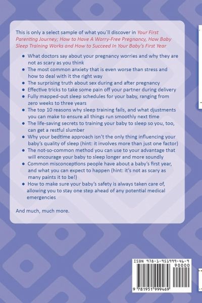 You can't describe the happiness you felt the moment you got the positive results of your pregnancy test. But only a couple of hours later, you catch yourself worrying about everything that could go wrong. Did I accidentally harm the baby before I knew I was pregnant? Are the antibiotics I took going to hurt my baby? Can exercise or stress at work cause preterm labor? Am I going to be a good mom? ...and the worst one "what if my child has a birth defect". Put the constant worrying to an end, and let's set things straight. This is only a select sample of what you'll discover in Your First Parenting Journey; How to Have A Worry-Free Pregnancy, How Baby Sleep Training Works and How to Succeed In Your Baby's First Year * What doctors say about your pregnancy worries and why they are not as scary as you think * The most common anxiety that is even worse than stress and how to deal with it the right way * The surprising truth about sex during and after pregnancy * Effective tricks to take some pain off your partner during delivery * Fully mapped-out sleep schedules for your baby, ranging from zero weeks to three years * The top 10 reasons why sleep training fails, and what adjustments you can make to ensure all things run smoothly next time * The life-saving secrets to training your baby to sleep so you, too, can get a restful slumber * Why your bedtime approach isn't the only thing influencing your baby's quality of sleep (hint: it involves more than just one factor) * The not-so-common method you can use to your advantage that will encourage your baby to sleep longer and more soundly * Common misconceptions people have about a baby's first year, and what you can expect to happen (hint: it's not as scary as many paints it to be!) * How to make sure your baby's safety is always taken care of, allowing you to stay one step ahead of any potential medical emergencies And much, much more. Yes, everyone around you thinks they know it all, yet each person is different and so is every pregnancy. That's why you know best what's good for your baby. Author Harley Carr knows one size does not fit all, that's why she hands you a goodie bag with a collection of advice and the newest science-backed facts about pregnancy, effective baby sleep training, and what to do in your baby's first year. Of course, YOU are the one deciding what to take and what to leave. When you want to turn your dark days and long nights around, so you do both you and your baby the favor of solving the sleep issues once and for all. If you also want to be prepared for your baby's sacred first year of life and discover how to be the perfect parent, then scroll up and click the "Add to Cart" button right now.