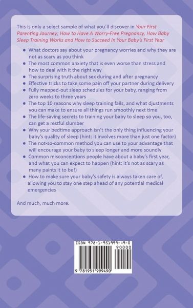 You can't describe the happiness you felt the moment you got the positive results of your pregnancy test. But only a couple of hours later, you catch yourself worrying about everything that could go wrong. Did I accidentally harm the baby before I knew I was pregnant? Are the antibiotics I took going to hurt my baby? Can exercise or stress at work cause preterm labor? Am I going to be a good mom? ...and the worst one "what if my child has a birth defect". Put the constant worrying to an end, and let's set things straight. This is only a select sample of what you'll discover in Your First Parenting Journey; How to Have A Worry-Free Pregnancy, How Baby Sleep Training Works and How to Succeed In Your Baby's First YearWhat doctors say about your pregnancy worries and why they are not as scary as you think The most common anxiety that is even worse than stress and how to deal with it the right way The surprising truth about sex during and after pregnancy Effective tricks to take some pain off your partner during delivery Fully mapped-out sleep schedules for your baby, ranging from zero weeks to three years The top 10 reasons why sleep training fails, and what adjustments you can make to ensure all things run smoothly next time The life-saving secrets to training your baby to sleep so you, too, can get a restful slumber Why your bedtime approach isn't the only thing influencing your baby's quality of sleep (hint: it involves more than just one factor) The not-so-common method you can use to your advantage that will encourage your baby to sleep longer and more soundly Common misconceptions people have about a baby's first year, and what you can expect to happen (hint: it's not as scary as many paints it to be!) How to make sure your baby's safety is always taken care of, allowing you to stay one step ahead of any potential medical emergencies And much, much more. Yes, everyone around you thinks they know it all, yet each person is different and so is every pregnancy. That's why you know best what's good for your baby. Author Harley Carr knows one size does not fit all, that's why she hands you a goodie bag with a collection of advice and the newest science-backed facts about pregnancy, effective baby sleep training, and what to do in your baby's first year. Of course, YOU are the one deciding what to take and what to leave. When you want to turn your dark days and long nights around, so you do both you and your baby the favor of solving the sleep issues once and for all. If you also want to be prepared for your baby's sacred first year of life and discover how to be the perfect parent, then scroll up and click the "Add to Cart" button right now.