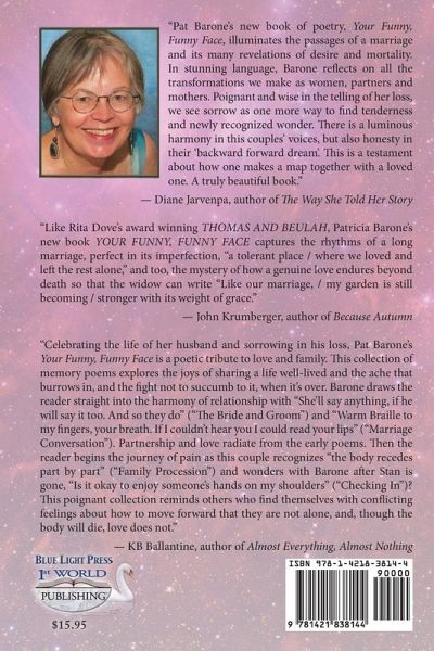 Pat Barone’s new book of poetry, Your Funny, Funny Face, illuminates the passages of a marriage and its many revelations of desire and mortality. In stunning language, Barone reflects on all the transformations we make as women, partners and mothers. Poignant and wise in the telling of her loss, we see sorrow as one more way to find tenderness and newly recognized wonder. There is a luminous harmony in this couples’ voices, but also honesty in their ‘backward forward dream’. This is a testament about how one makes a map together with a loved one. A truly beautiful book. Patricia Barone’s latest book, Your Funny, Funny Face, Blue Light Press, is her fourth book, third collection of poetry. A previous collection, The Scent of Water is from the same press. New Rivers Press published her first book of poetry, Handmade Paper, and a novella, The Wind. Her poetry and short stories have appeared in anthologies such as Bless Me Father, by Plume/Penguin, and Inspired by Tagore, Birmingham, England, as well as others from Peter Lang, Prentice Merrill, and Wising Up Press. Periodicals include The American Poetry Journal, The Shop (Ireland), Great River Review, Pleiades, Commonweal, The Seattle Review, Visions International, and the Widener Review. She has received a Loft-McKnight Award of Distinction in poetry, a Lake Superior Contemporary Writers Award for a short story, and a Minnesota State Arts Board Career Opportunity Grant for a workshop with the Irish poet Eavan Boland.