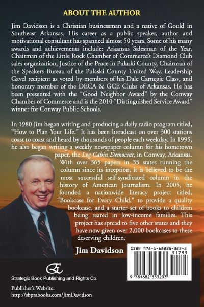 About the Author: Jim Davidson is a Christian businessman and a native of Gould in Southeast Arkansas. His career as a public speaker, author and motivational consultant has spanned almost 50 years. Some of his many awards and achievements include: Arkansas Salesman of the Year, Chairman of the Little Rock Chamber of Commerce's Diamond Club sales organization, Justice of the Peace in Pulaski County, Chairman of the Speakers Bureau of the Pulaski County United Way, Leadership Gavel recipient as voted by members of his Dale Carnegie Class, and honorary member of the DECA & GCE Clubs of Arkansas. He has been presented with the "Good Neighbor Award" by the Conway Chamber of Commerce and is the 2010 "Distinguished Service Award" winner for Conway Public Schools. In 1980 Jim began writing and producing a daily radio program titled, "How to Plan Your Life." It has been broadcast on over 300 stations coast to coast and heard by thousands of people each weekday. In 1995, he also began writing a weekly newspaper column for his hometown newspaper, the Log Cabin Democrat, in Conway, Arkansas. With over 365 papers in 35 states running the column since its inception, it is believed to be the most successful self-syndicated column in the history of American journalism. In 2005, he founded a nationwide literacy program titled, "A Bookcase for Every Child," to provide a quality bookcase, and a starter set of books to children being reared in low-income families. This project has spread to five other states and they have now given over 2,000 bookcases to those deserving children. His last work may be the most important. Jim has made a commitment to partner with Arkansas PBS to develop a curriculum to teach pre-school children the success habits of Character, Integrity, Respect and Manners. He believes that, in time, this will change the culture of violence in America.