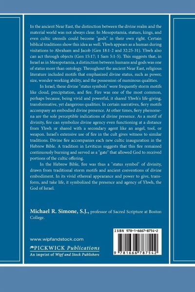 In the ancient Near East, the distinction between the divine realm and the material world was not always clear. In Mesopotamia, statues, kings, and even cultic utensils could become ""gods"" in their own right. Certain biblical traditions show this idea as well. Yhwh appears as a human during visitations to Abraham and Jacob (Gen 18:1-2 and 32:25-31). Yhwh also can act through objects (Gen 15:17; 1 Sam 5:1-5). This suggests that, in Israel as in Mesopotamia, a distinction between humans and gods was one of status more than ontology. Throughout the ancient Near East, religious literature included motifs that emphasized divine status, such as power, size, wonder-working ability, and the possession of numinous qualities. In Israel, these divine ""status symbols"" were frequently storm motifs like cloud, precipitation, and fire. Fire was one of the most common, perhaps because, being vivid and powerful, it shared Yhwh's life-giving, transformative, yet dangerous qualities. In certain narratives, fiery motifs accompany an embodied divine presence. At other times, fiery phenomena are the sole perceptible indications of divine presence. As a motif of divinity, fire can symbolize divine agency even functioning at a distance from Yhwh or shared with a secondary agent like an angel, tool, or weapon. Israel's extensive use of fire in the cult gives witness to similar traditions. Divine fire accompanies each new cultic inauguration in the Hebrew Bible. A tradition in Leviticus suggests that this fire remained continuously burning and served as a ""gate"" that allowed God to received portions of the cultic offering. In the Hebrew Bible, fire was thus a ""status symbol"" of divinity, drawn from traditional storm motifs and ancient conventions of divine embodiment. In its vivid ethereal appearance and power to give, transform, and take life, it symbolized the presence and agency of Yhwh, the God of Israel.