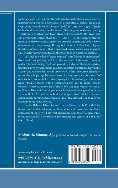 In the ancient Near East, the distinction between the divine realm and the material world was not always clear. In Mesopotamia, statues, kings, and even cultic utensils could become ""gods"" in their own right. Certain biblical traditions show this idea as well. Yhwh appears as a human during visitations to Abraham and Jacob (Gen 18:1-2 and 32:25-31). Yhwh also can act through objects (Gen 15:17; 1 Sam 5:1-5). This suggests that, in Israel as in Mesopotamia, a distinction between humans and gods was one of status more than ontology. Throughout the ancient Near East, religious literature included motifs that emphasized divine status, such as power, size, wonder-working ability, and the possession of numinous qualities. In Israel, these divine ""status symbols"" were frequently storm motifs like cloud, precipitation, and fire. Fire was one of the most common, perhaps because, being vivid and powerful, it shared Yhwh's life-giving, transformative, yet dangerous qualities. In certain narratives, fiery motifs accompany an embodied divine presence. At other times, fiery phenomena are the sole perceptible indications of divine presence. As a motif of divinity, fire can symbolize divine agency even functioning at a distance from Yhwh or shared with a secondary agent like an angel, tool, or weapon. Israel's extensive use of fire in the cult gives witness to similar traditions. Divine fire accompanies each new cultic inauguration in the Hebrew Bible. A tradition in Leviticus suggests that this fire remained continuously burning and served as a ""gate"" that allowed God to received portions of the cultic offering. In the Hebrew Bible, fire was thus a ""status symbol"" of divinity, drawn from traditional storm motifs and ancient conventions of divine embodiment. In its vivid ethereal appearance and power to give, transform, and take life, it symbolized the presence and agency of Yhwh, the God of Israel.