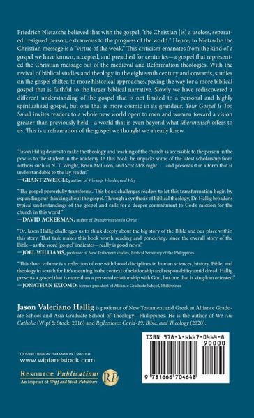 Friedrich Nietzsche believed that with the gospel, ""the Christian [is] a useless, separated, resigned person, extraneous to the progress of the world."" Hence, to Nietzsche the Christian message is a ""virtue of the weak."" This criticism emanates from the kind of a gospel we have known, accepted, and preached for centuries--a gospel that represented the Christian message out of the medieval and Reformation theologies. With the revival of biblical studies and theology in the eighteenth century and onwards, studies on the gospel shifted to more historical approaches, paving the way for a more biblical gospel that is faithful to the larger biblical narrative. Slowly we have rediscovered a different understanding of the gospel that is not limited to a personal and highly spiritualized gospel, but one that is more cosmic in its grandeur. Your Gospel Is Too Small invites readers to a whole new world open to men and women toward a vision greater than previously held--a world that is even beyond what ubermensch offers to us. This is a reframation of the gospel we thought we already knew.