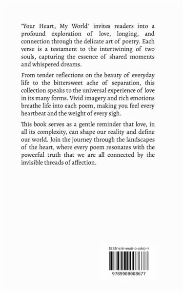 "Your Heart, My World" invites readers into a profound exploration of love, longing, and connection through the delicate art of poetry. Each verse is a testament to the intertwining of two souls, capturing the essence of shared moments and whispered dreams. From tender reflections on the beauty of everyday life to the bittersweet ache of separation, this collection speaks to the universal experience of love in its many forms. Vivid imagery and rich emotions breathe life into each poem, making you feel every heartbeat and the weight of every sigh. This book serves as a gentle reminder that love, in all its complexity, can shape our reality and define our world. Join the journey through the landscapes of the heart, where every poem resonates with the powerful truth that we are all connected by the invisible threads of affection.