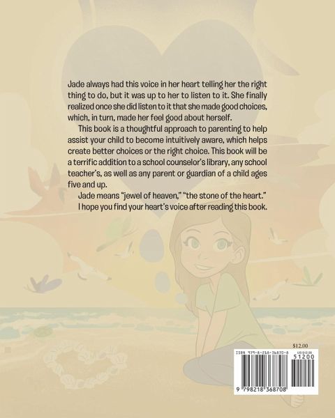 Jade always had this voice in her heart telling her the right thing to do, but it was up to her to listen to it. She finally realized once she did listen to it that she made good choices, which, in turn, made her feel good about herself. This book is a thoughtful approach to parenting to help assist your child to become intuitively aware, which helps create better choices or the right choice. This book will be a terrific addition to a school counselor's library, any school teacher's, as well as any parent or guardian of a child ages five and up. Jade means "jewel of heaven," "the stone of the heart." I hope you find your heart's voice after reading this book.