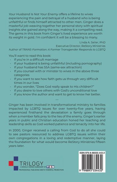 Your Husband Is Not Your Enemy offers a lifeline to wives experiencing the pain and betrayal of a husband who is being unfaithful or finds himself attracted to other men. Ginger does a masterful job weaving together her personal story with spiritual insights she gained along the way, making it a compelling read. The gems in this book from Ginger's lived experience are worth its weight in gold. I'm confident it will be a blessing to many. , Linda A. Seiler, PhD Executive Director, ReStory Ministries, Author of TRANS-Formation: A Former Transgender Responds to LGBTQ You'll want to read this book: ¿ If you're in a difficult marriage ¿ If your husband is being unfaithful (including pornography) ¿ If your husband has SSA (same-sex attraction) ¿ If you counsel with or minister to wives in the above three categories ¿ If you want to see how faith gets us through very difficult times in our lives ¿ If you wonder, "Does God really speak to His children?" ¿ If you desire to love others with God's unconditional love ¿ If you know the author and want to get to know her better.