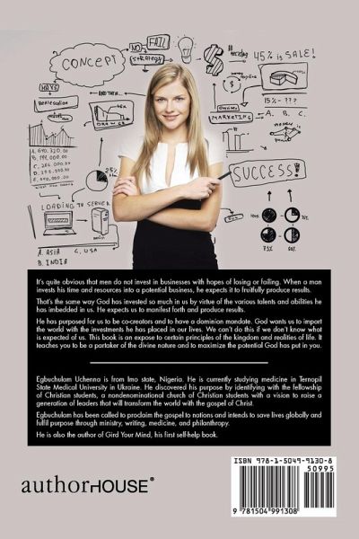 It's quite obvious that men do not invest in businesses with hopes of losing or failing. When a man invests his time and resources into a potential business, he expects it to fruitfully produce results. That's the same way God has invested so much in us by virtue of the various talents and abilities he has imbedded in us. He expects us to manifest forth and produce results. He has purposed for us to be co-creators and to have a dominion mandate. God wants us to impart the world with the investments he has placed in our lives. We can't do this if we don't know what is expected of us. This book is an expose to certain principles of the kingdom and realities of life. It teaches you to be a partaker of the divine nature and to maximize the potential God has put in you.