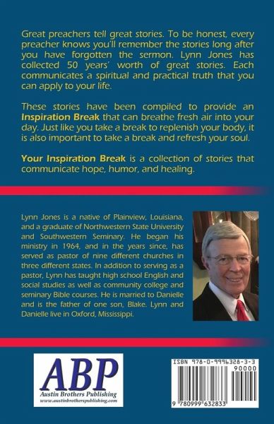Great preachers tell great stories. To be honest, every preacher knows you’ll remember the stories long after you have forgotten the sermon. Lynn Jones has collected 50 years’ worth of great stories. Each communicates a spiritual and practical truth that you can apply to your life. These stories have been compiled to provide an Inspiration Break that can breathe fresh air into your day. Just like you take a break to replenish your body, it is also important to take a break and refresh your soul. Your Inspiration Break is a collection of stories that communicate hope, humor, and healing. Lynn Jones is a native of Plainview, Louisiana, and is a graduate of Plainview High School. He is a graduate of Northwestern State University in Natchitoches, Louisiana and Southwestern Seminary in Fort Worth, Texas. He began his ministry in 1964, and in the years since, has served as pastor of nine different churches in three different states. In addition to serving as a pastor, Lynn has taught high school English and social studies as well as community college and seminary Bible courses. He is married to Danielle and is the father of one son, Blake. Lynn and Danielle live in Oxford, Mississippi.