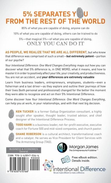 Most people do not know what their I.D. is. . .No, not their identification, but their Intentional Difference. Eighty-five percent of what we are capable of doing, most other people can do just as well. Ten percent of what we are capable of doing, some others can be trained to do. But five percent. . .five percent of what we are capable of doing, only we can do the way we do it. This is our Intentional Difference. If we spent 95 percent of our time in our five percent, we would change the world while increasing our own level of success. Your Intentional Difference is the key and this book will…mehr