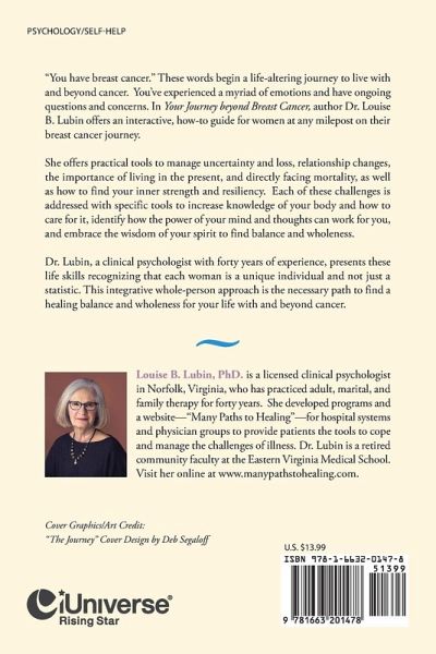 "You have breast cancer." These words begin a life-altering journey to live with and beyond cancer. You've experienced a myriad of emotions and have ongoing questions and concerns. In Your Journey beyond Breast Cancer, author Dr. Louise B. Lubin offers an interactive, how-to guide for women at any milepost on their breast cancer journey. She offers practical tools to manage uncertainty and loss, relationship changes, the importance of living in the present, and directly facing mortality, as well as how to find your inner strength and resiliency. Each of these challenges is addressed with specific tools to increase knowledge of your body and how to care for it, identify how the power of your mind and thoughts can work for you, and embrace the wisdom of your spirit to find balance and wholeness. Dr. Lubin, a clinical psychologist with forty years of experience, presents these life skills recognizing that each woman is a unique individual and not just a statistic. This integrative whole-person approach is the necessary path to find a healing balance and wholeness for your life with and beyond cancer.