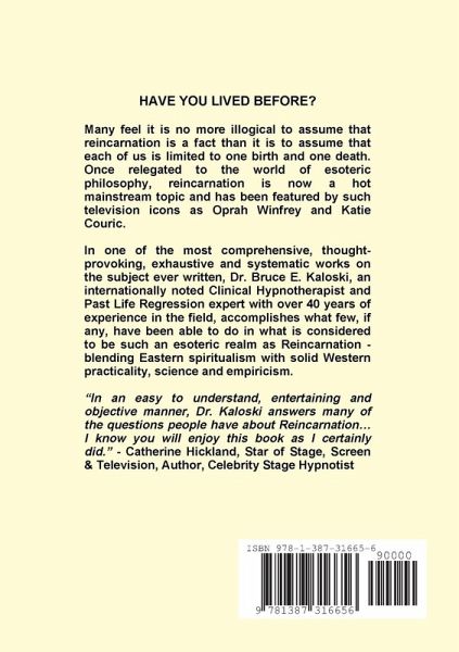 HAVE YOU LIVED BEFORE? Many feel it is no more illogical to assume that reincarnation is a fact than it is to assume that each of us is limited to one birth and one death. Once relegated to the world of esoteric philosophy, reincarnation is now a hot mainstream topic and has been featured by such television icons as Oprah Winfrey and Katie Couric. In one of the most comprehensive, thought-provoking, exhaustive and systematic works on the subject ever written, Dr. Bruce E. Kaloski, an internationally noted Clinical Hypnotherapist and Past Life Regression expert with over 40 years of experience in the field, accomplishes what few, if any, have been able to do in what is considered to be such an esoteric realm as Reincarnation - blending Eastern spiritualism with solid Western practicality, science and empiricism.