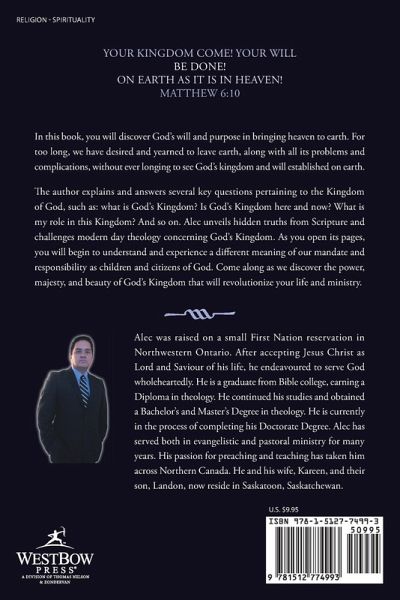 Your kingdom come! Your will be done! On earth as it is in heaven! Matthew 6:10 In this book, you will discover God’s will and purpose in bringing heaven to earth. For too long, we have desired and yearned to leave earth, along with all its problems and complications, without ever longing to see God’s kingdom and will established on earth. The author explains and answers several key questions pertaining to the Kingdom of God, such as: what is God’s Kingdom? Is God’s Kingdom here and now? What is my role in this Kingdom? And so on. Alec unveils hidden truths from Scripture and challenges modern day theology concerning God’s Kingdom. As you open its pages, you will begin to understand and experience a different meaning of our mandate and responsibility as children and citizens of God. Come along as we discover the power, majesty, and beauty of God’s Kingdom that will revolutionize your life and ministry.