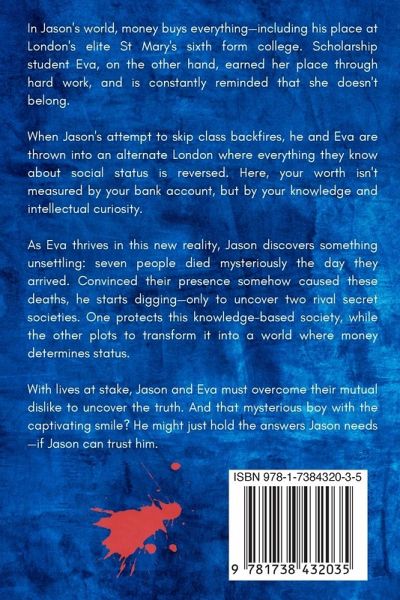 In Jason's world, money buys everything-including his place at London's elite St Mary's sixth form college, where he coasts through classes while his parents' "donations" keep him enrolled. Eva, on the other hand, earned her scholarship through hard work, enduring daily reminders that she doesn't belong among her wealthy peers. When Jason's attempt to skip class backfires spectacularly, he and Eva find themselves thrown into an alternate London where everything they know about social status is reversed. Here, your worth isn't measured by your bank account, but by your knowledge and intellectual curiosity. As Eva thrives in this new reality, Jason discovers something unsettling: seven people died in freak accidents the day they arrived. Convinced their presence somehow caused these deaths, he starts digging-only to uncover two secret societies with opposing visions. One protects the foundations of this knowledge-based society, while the other secretly plots to transform it into a world where money determines status. With lives at stake, Jason and Eva must overcome their mutual dislike to uncover the truth. And that mysterious boy with the captivating smile? He might just hold the answers Jason needs-if Jason can trust him.