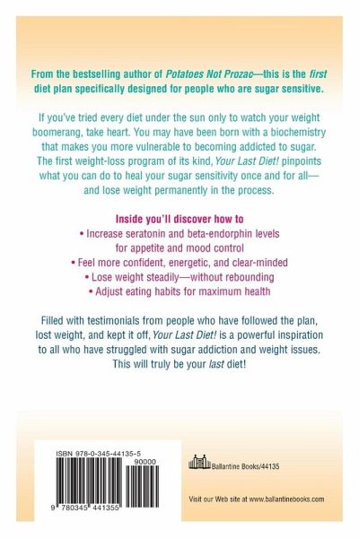 From the bestselling author of Potatoes Not Prozac-this is the first diet plan specifically designed for people who are sugar sensitive. If you've tried every diet under the sun only to watch your weight boomerang, take heart. You may have been born with a biochemistry that makes you more vulnerable to becoming addicted to sugar. The first weight-loss program of its kind, Your Last Diet! pinpoints what you can do to heal your sugar sensitivity once and for all-and lose weight permanently in the process. Inside you'll discover how to • Increase seratonin and beta-endorphin levels for appetite and mood control • Feel more confident, energetic, and clear-minded • Lose weight steadily-without rebounding • Adjust eating habits for maximum health Filled with testimonials from people who have followed the plan, lost weight, and kept it off, Your Last Diet! is a powerful inspiration to all who have struggled with sugar addiction and weight issues. This will truly be your last diet!
