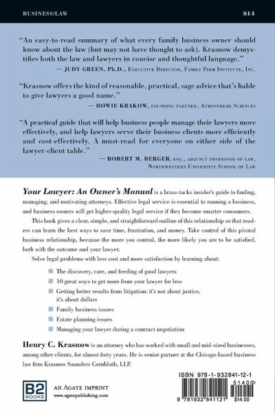 This book offers business owners and managers a new and more effective way to think about lawyers, law, and litigation. Your Lawyer: An Owner's Manual is a brass-tacks guide that demonstrates smarter ways to find, work with, and motivate attorneys. Author Henry C. Krasnow is an attorney with four decades of experience helping businesses, and he writes with an insider's perspective on what business owners need to know about managing this pivotal business relationship. The book outlines this relationship in ways that are clear, simple, and straightforward, so that readers can learn ways to save time, frustration, and money. It furnishes a useful overview of the entire legal process--what's happening, why it's happening, and even why it's often so frustrating.