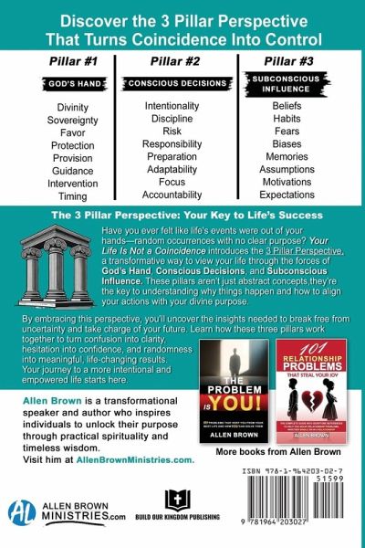 Do you ever feel like the events of your life are random or disconnected? What if you discovered that every step, every detour, and even every setback was part of a greater plan? Your Life Is Not a Coincidence reveals the powerful truth that nothing in life is by chance. Through deeply personal stories, biblical wisdom, and actionable insights, Allen Brown unveils how God's hand, conscious decisions, and subconscious influences work together to shape your journey. In this transformative book, you'll explore: God's Hand: How divine intervention and timing orchestrate the events of your life. Conscious Decisions: The power of intentional choices in aligning with your purpose. Subconscious Influences: Identifying hidden patterns that either propel or hinder your success. With each chapter, Allen challenges you to reflect on your past, embrace your present, and take bold steps toward your God-given destiny. Packed with exercises and thought-provoking guidance, this book equips you to uncover the divine purpose in your life and make decisions that align with your faith and values. Whether you're seeking clarity, struggling with life's challenges, or simply looking to deepen your relationship with God, Your Life Is Not a Coincidence will inspire you to trust in the unseen and recognize the divine threads woven into your story. Your journey to a purposeful life begins here. Discover how every moment-no matter how small-is part of a bigger plan, and step confidently into the future God has prepared for you.